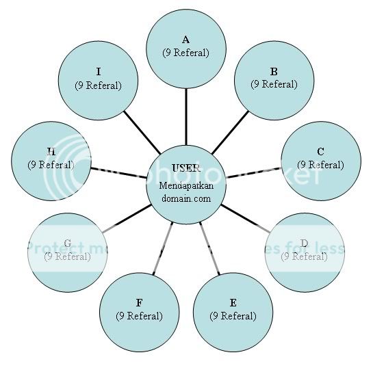Untuk mendapatkan Domain tersebut caranya adalah Anda harus mencari 9 orang agar ikut terdaftar melalui referal Anda, ilustrasinya adalah sebagai berikut :